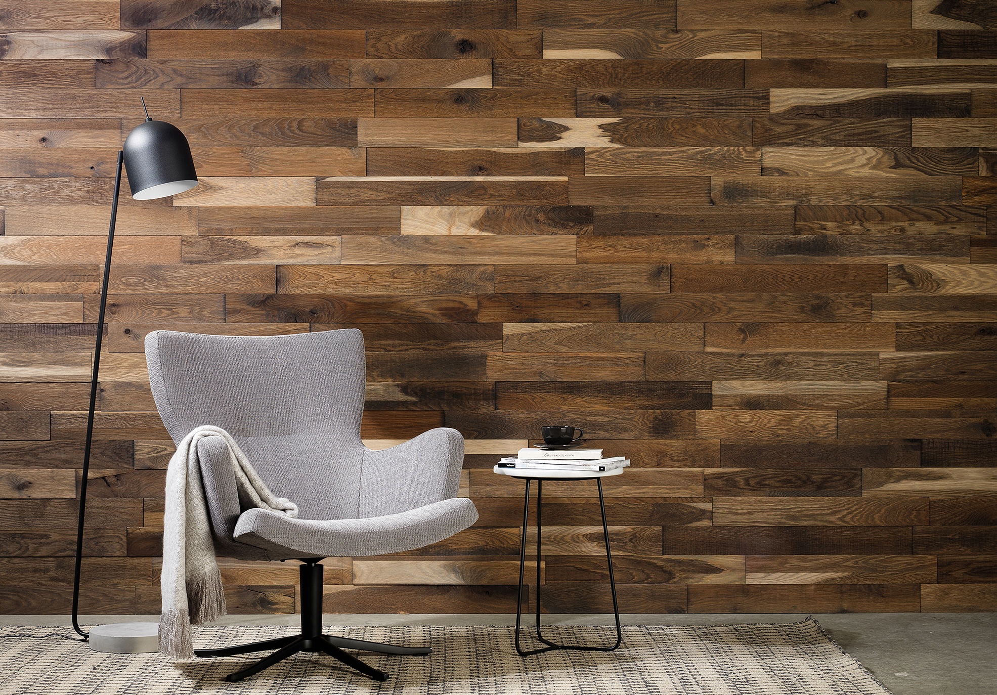 Diverging nature and nostalgia these Interplait Eco-Panels communicate a blend of textures in a serene tonal range with an interlocking installation in either White Oak or Walnut. Beautifully tactile this sustainable, enriched, offering compliments the additional interlocking wood panel groupings for an exalted industrial aesthetic.